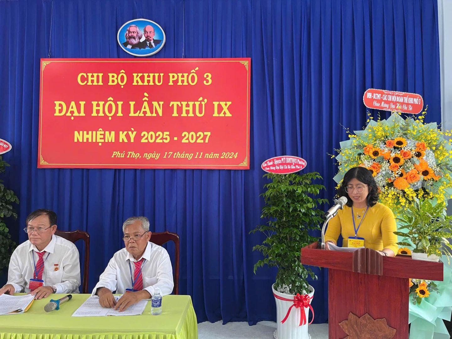 Phát biểu chỉ đạo tại Đại hội, đồng chí Võ Thị Lý nhấn mạnh vai trò then chốt của Chi bộ trong việc phát huy năng lực lãnh đạo, giữ vững tinh thần đoàn kết để thực hiện thắng lợi Nghị quyết Đại hội Chi bộ, góp phần vào sự phát triển chung của địa phương. Đồng chí củng biểu dương những nỗ lực của Chi bộ khu phố 3 trong việc duy trì và phát triển các phong trào văn hóa, xã hội, đồng thời yêu cầu tiếp tục đổi mới phương pháp lãnh đạo, tạo đà phát triển bền vững trong nhiệm kỳ mới.