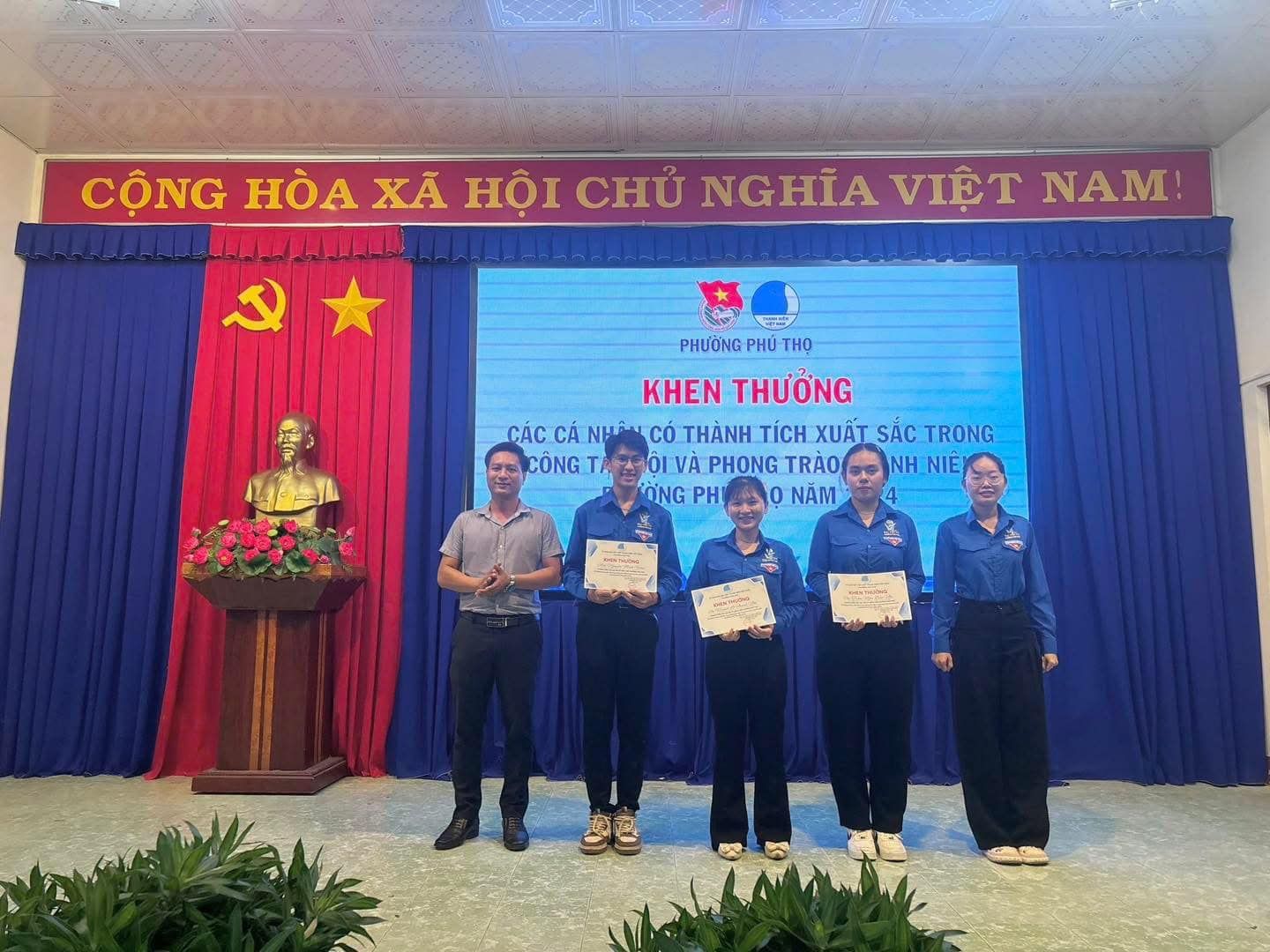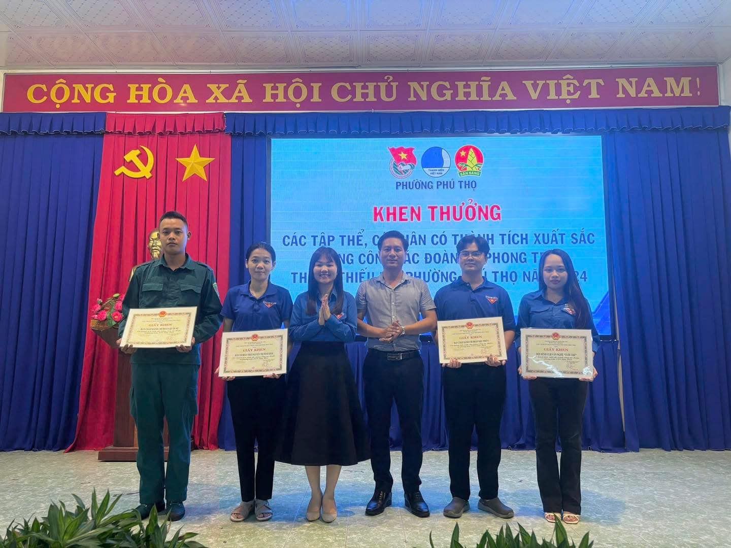 Đồng thời trao khen thưởng của Chủ tịch UBND phường cho 04 tập thể và 07 cá nhân xuất sắc trong công tác Đoàn và phong trào TTN phường Phú Thọ năm 2024; trao khen thưởng của UB Hội phường cho 03 cá nhân có thành tích xuất sắc trong công tác Hội và phong trào Thanh niên năm 2024 và đặc biệt 03 cá nhân này được công nhận là HLV cấp I tỉnh Bình Dương - Bình Phước tại Hội trại Chung dòng Sông Bé năm 2024 vừa qua; trao tuyên dương của UB Hội phường cho 05 cá nhân có thành tích tiêu biểu trong công tác Hội và phong trào Thanh niên năm 2024; trao tuyên dương của UB Hội phường cho 05 cá nhân có thành tích tiêu biểu trong thực hiện Đề án ĐKTH TNCN&LĐT phường năm 2024./.