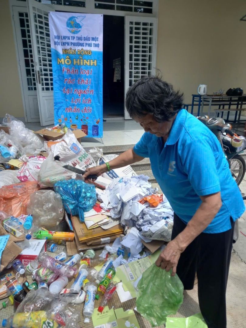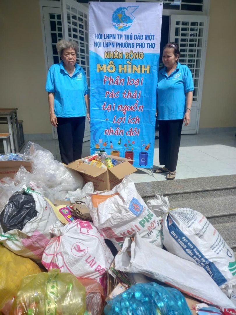 Thực hiện Đề án Nâng cao chất lượng Cuộc vận động “Xây dựng nếp sống văn hóa - văn minh đô thị” trên địa bàn thành phố Thủ Dầu Một, giai đoạn 2021 – 2025, Hội LHPN phường Phú Thọ tiếp tục nhân rộng mô hình “Phân loại rác thải tại nguồn – Lợi ích nhân đôi” tại Chi hội phụ nữ khu phố 3. Ngày 26/10/2024, chi hội phụ nữ khu phố 3 tiếp tục nhận được sự ủng hộ rác thải được phân loại từ phía hội viên, phụ nữ. Qua đó, chi hội tiếp nhận 165kg rác thải do hội viên và nhân dân ủng hộ, nhận về 416.000 đồng tiền thanh lý, tiếp tục bổ sung nguồn quỹ thực hiện các hoạt động chăm lo phúc lợi cho hội viên và nhân dân.