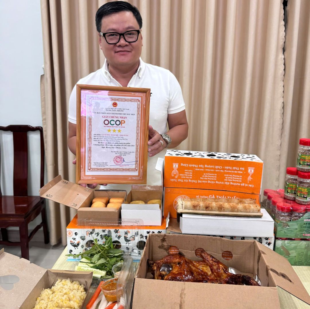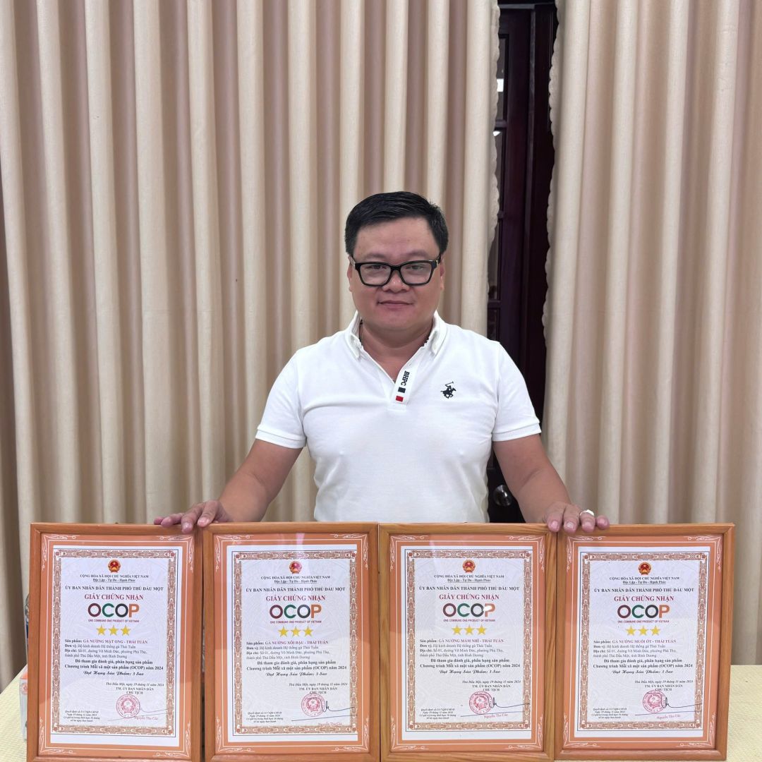 Theo đó, đợt này Ủy ban nhân dân phường Phú Thọ có 04 sản phẩm tham gia đăng ký đánh giá, phân hạng sản phẩm OCOP, chủ thể là hộ kinh doanh hệ thống gà Thái Tuấn có địa chỉ tại: Số 01, đường Võ Minh Đức, phường Phú Thọ, thành phố Thủ Dầu Một, tỉnh Bình Dương, Việt Nam được công nhận đạt 04 sản phẩm OCOP 03 sao cấp thành phố.