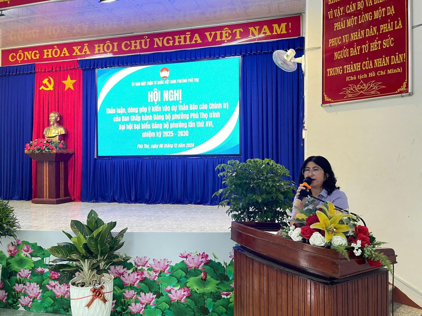 Phát biểu tại Hội nghị, bà Võ Thị Lý – Thành ủy viên, Bí thư Đảng ủy phường ghi nhận và đánh giá cao những ý kiến đóng góp của các vị đại biểu, giúp Ban Chấp hành Đảng bộ phường nắm bắt được tư tưởng, tâm tư, nguyện vọng của cán bộ, đảng viên và các tầng lớp nhân dân để bổ sung vào chủ trương, định hướng phát triển của địa phương, cụ thể hóa vào Dự thảo Báo cáo Chính trị của Ban Chấp hành Đảng bộ phường trình tại Đại hội Đại biểu Đảng bộ phường lần thứ XVI nhiệm kỳ 2025 – 2030, quyết tâm xây dựng phường Phú Thọ ngày càng giàu đẹp, văn minh, hiện đại, cùng thành phố Thủ Dầu Một thực hiện thành công sự nghiệp đổi mới toàn diện, đồng bộ.